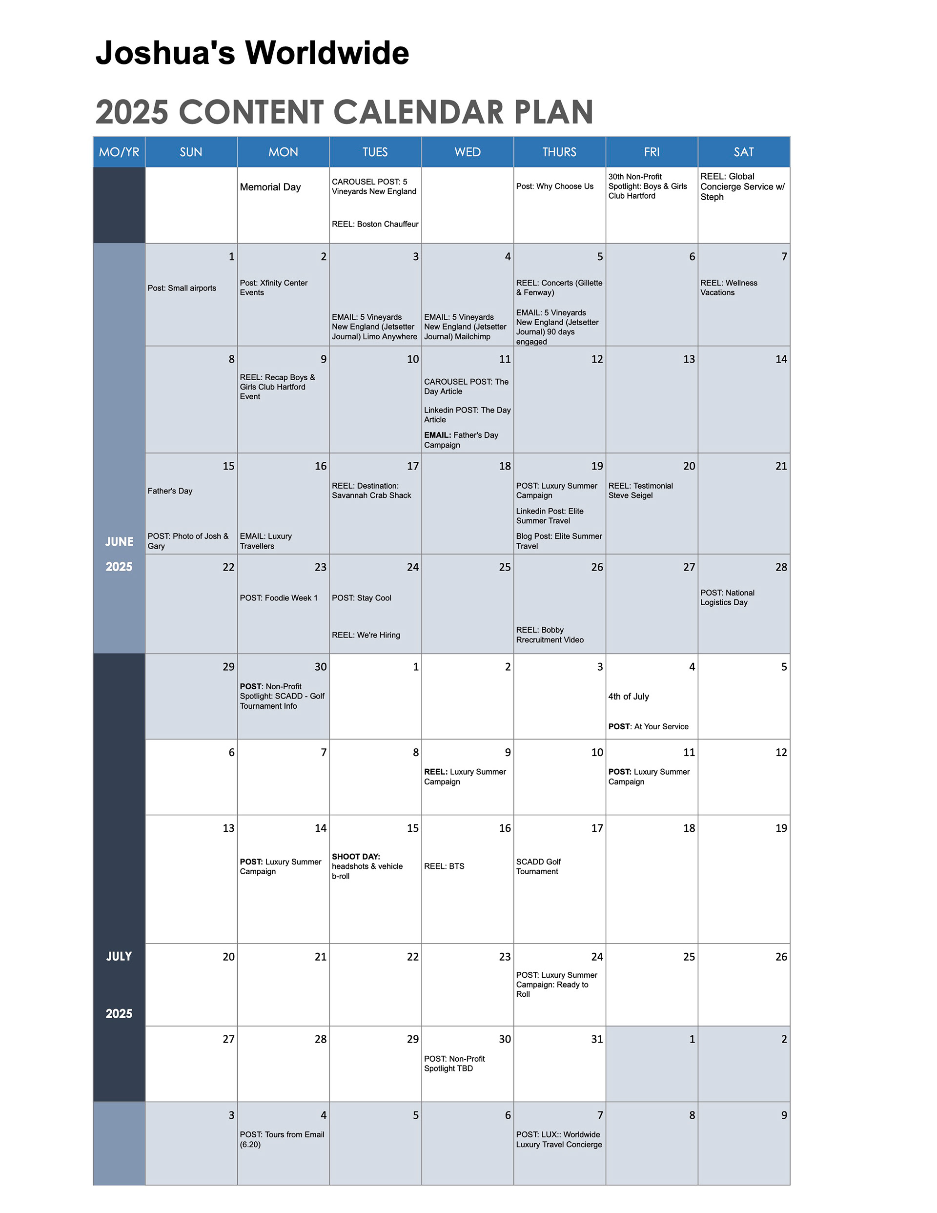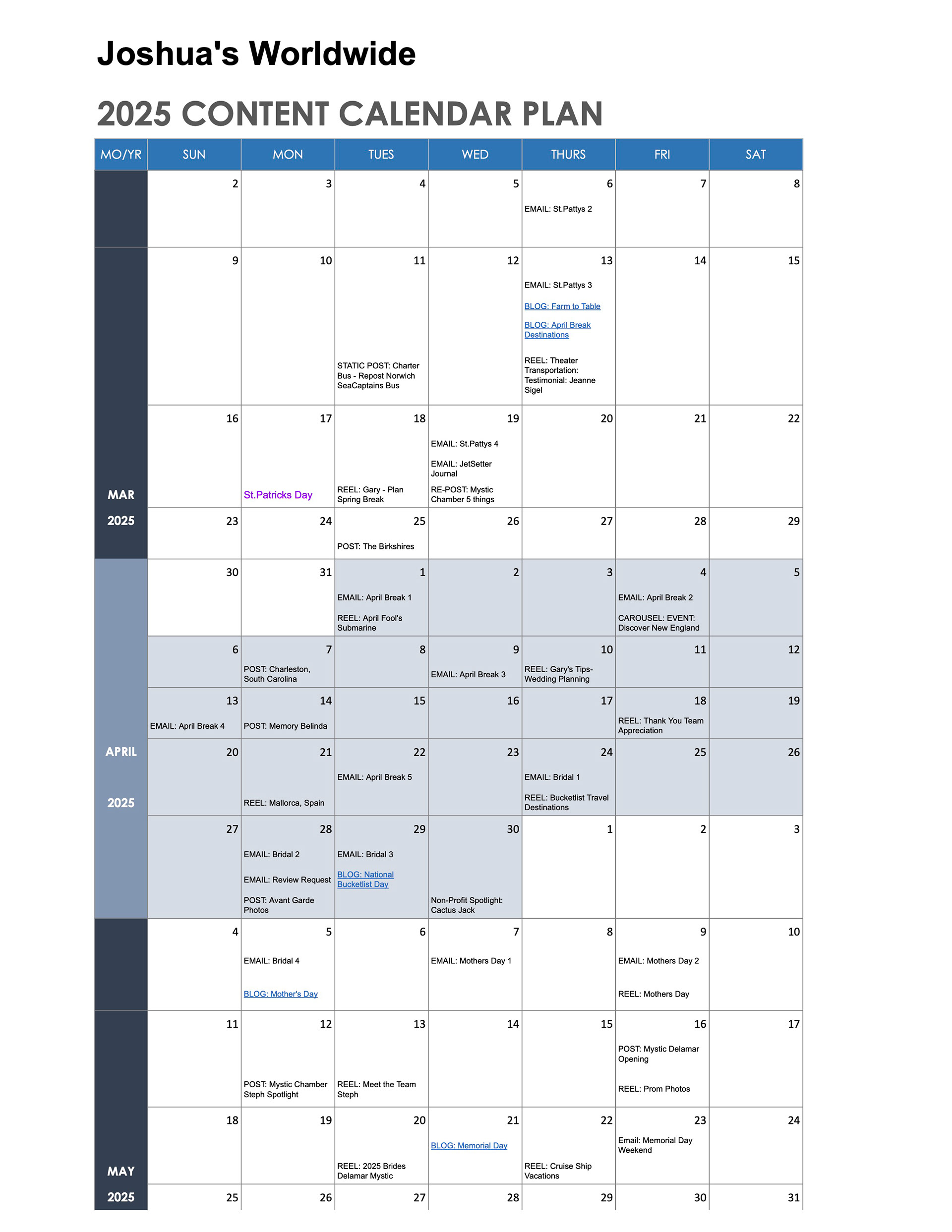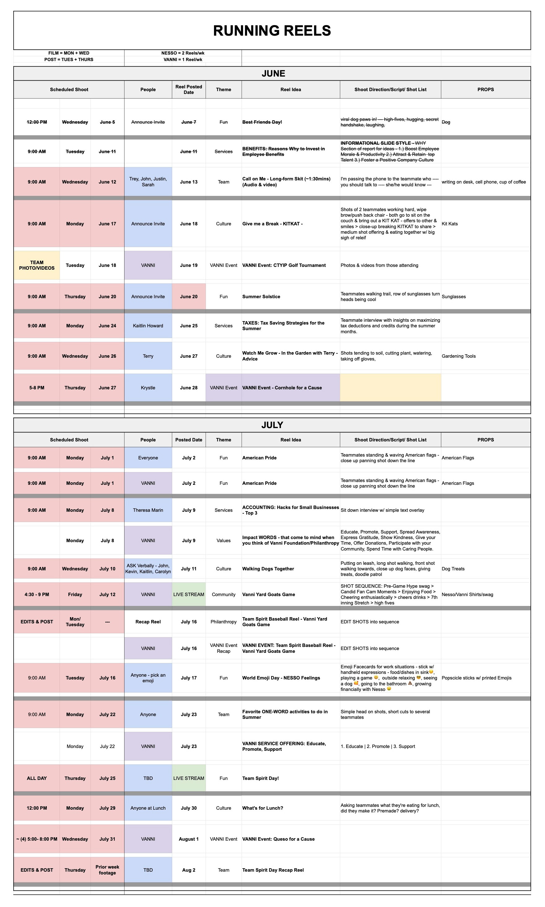 ROLE: As a Marketing and Brand Manager, my style of communication is direct, tactful, collaborative, and resourceful. I manage multiple concurrent marketing initiatives and lead weekly calls with our various clients. I built a structured project management framework where each client has their own shared Google Sheet with a visual content calendar and a Google Document with tabs that reference all call agendas, production shoot schedules, project deliverables, etc. I find this type of open and regular communication creates an effective and efficient process. During meetings, time is allocated for discussion/questions/concerns, tasks are assigned, and a Slack discussion channel remains open for lingering follow-up, without cluttering our inboxes.